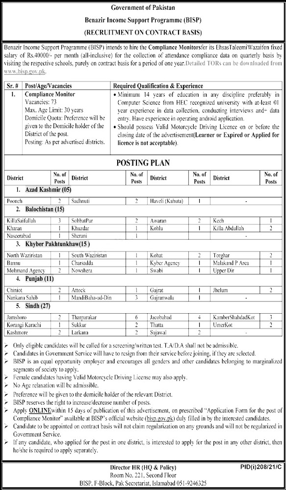 Address: Director HR (HQ & Policy), Room No. 221, Second Floor, BISP, F Block, Pak Secretariat, Islamabad