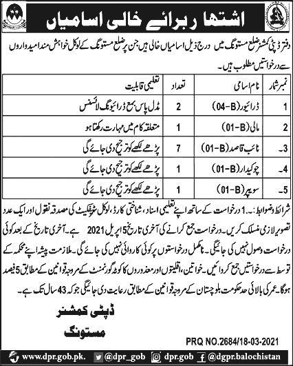 Deputy Commissioner Office Mastung Class IV Govt Jobs 2021