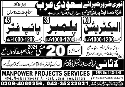 Arabia is seeking candidates for the posts of Electrician, Plumber, Pipe