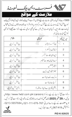 If you’re looking to build your career in a reputable bank, here’s your chance! First Women Bank Limited (FWBL) is inviting applications from qualified and experienced professionals for various positions at its Karachi branch.