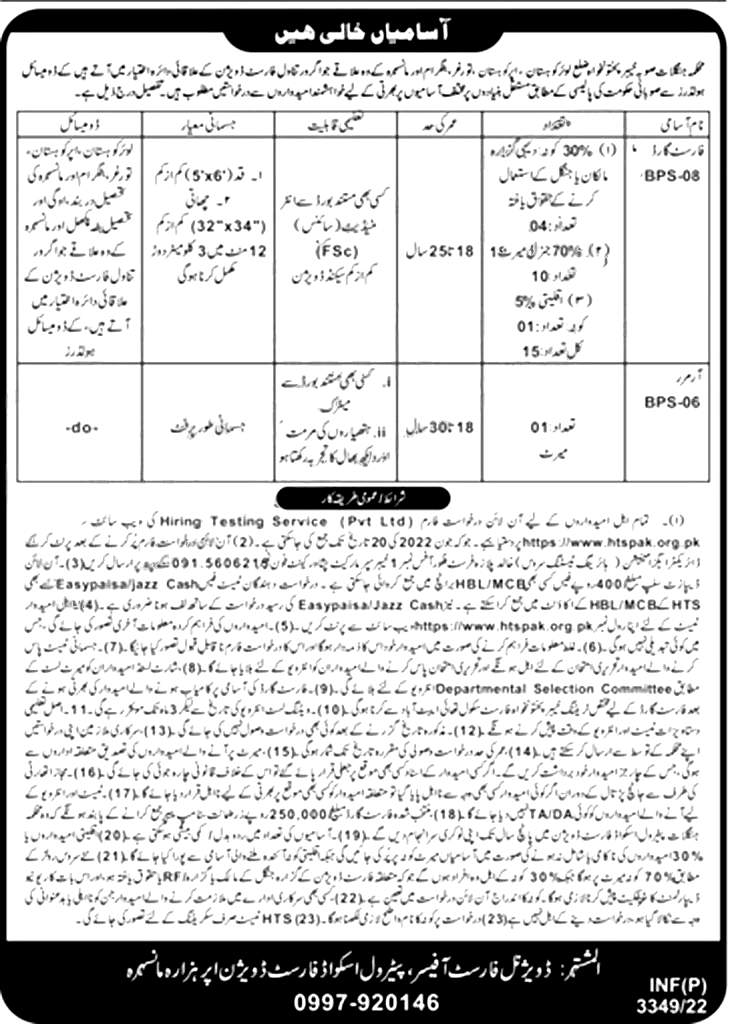 Forest Department Khyber Pakhtunkhwa is hiring applications to fill the vacant posts of Forest Guards and Armourer. This appointment will be made purely on regular basis. Forest Department is hiring Forest Guards for its Agror Tanawal Forest Division.