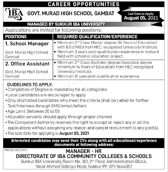 Government Murad High School Gambat is looking for a School Manager and Office Assistant. Interested applicants who want to get employment against these positions are required to fill the eligibility requirements of the post listed below. Candidates who are between 20 to 55 years of age are applicable for these positions.