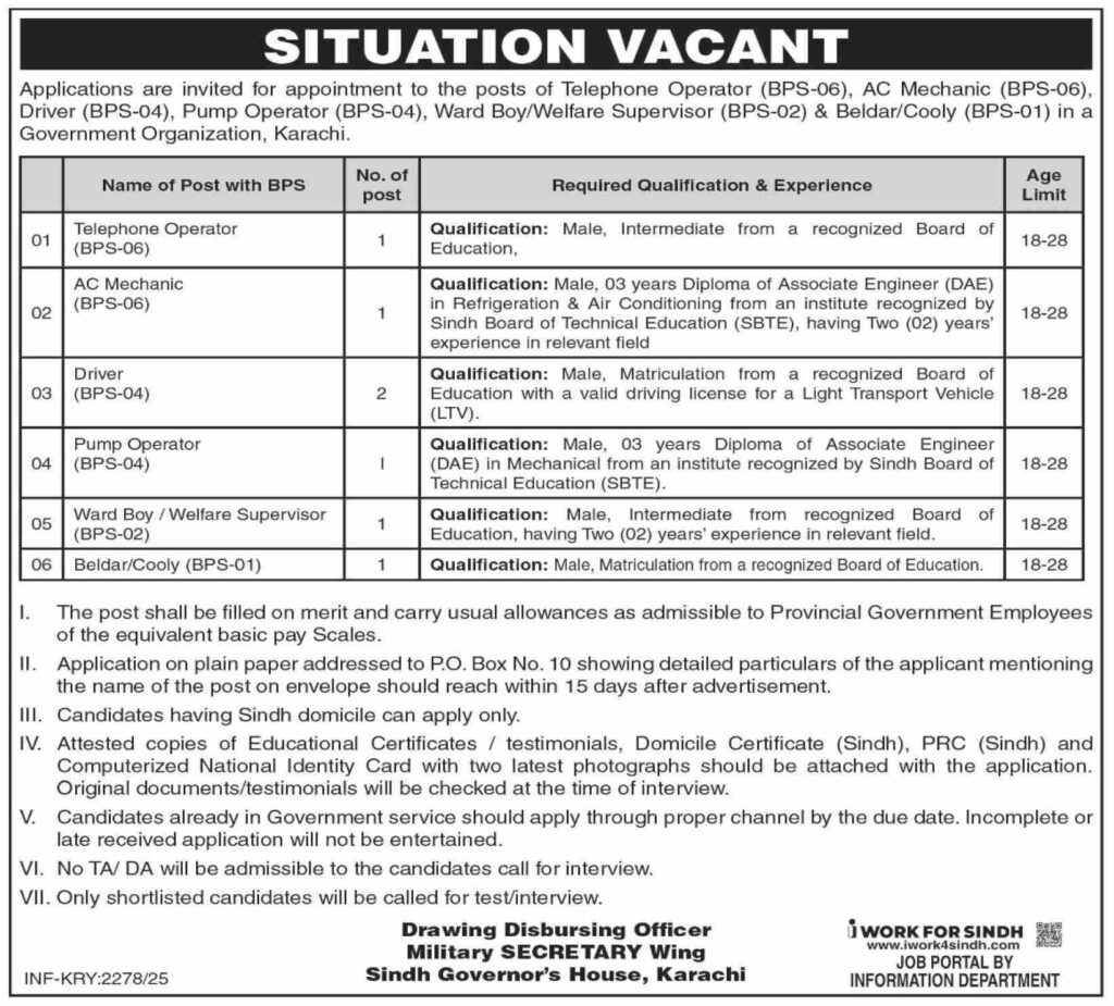 Governor House Jobs 2025 telephone operator welfare supervisor pump operator beldar AC mechanic and driver positions are advertised by the Governor’s House Pakistan as per 23 July 2025 advertisements. People with Middle Intermediate and Matric. Educational institutions are eligible to apply.