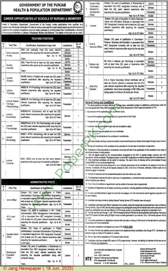 Health & Population Department invites applications for vacancies advertised in the daily Jang 20 July 2025. Vacancies are within the H-8 area of Islamabad, Pakistan. Nursing instructor People with MS or Master, Other and Bachelor Education on is eligible for admission.