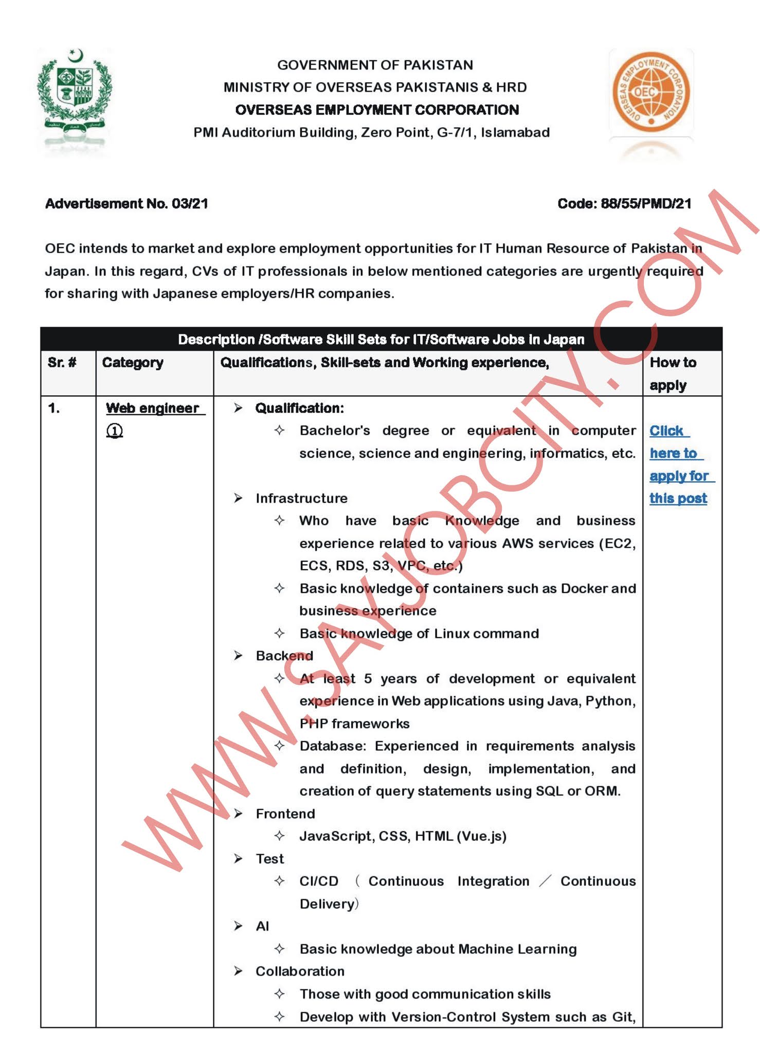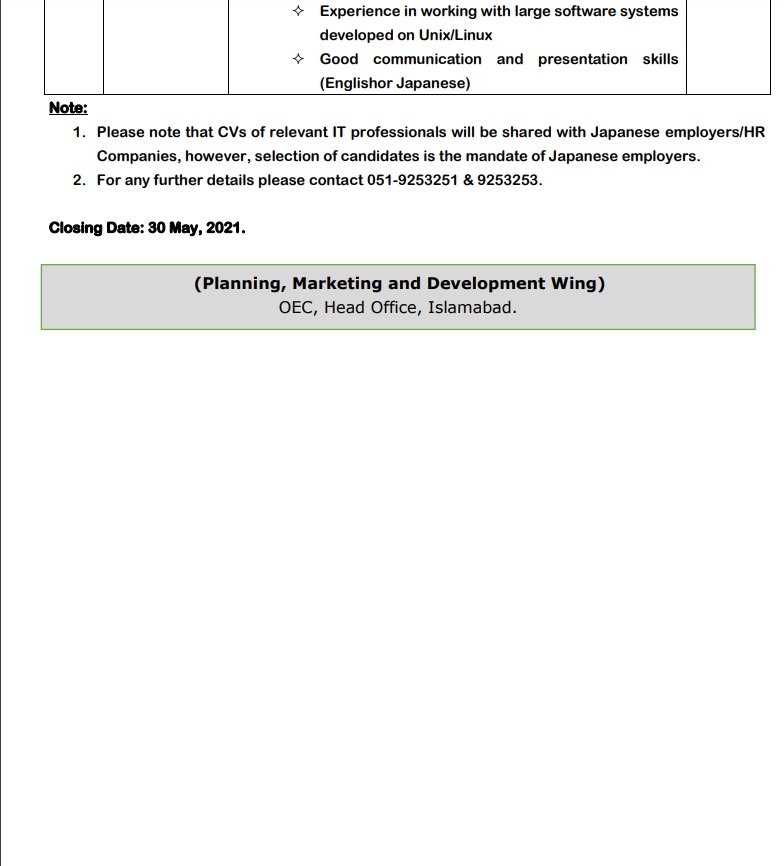 OEC intends to market & explore employment opportunities for IT HR of Pakistan in Japan. Regard CV of IT professionals in below mentioned categories are urgently required for sharing with Japanese employers-HR companies.