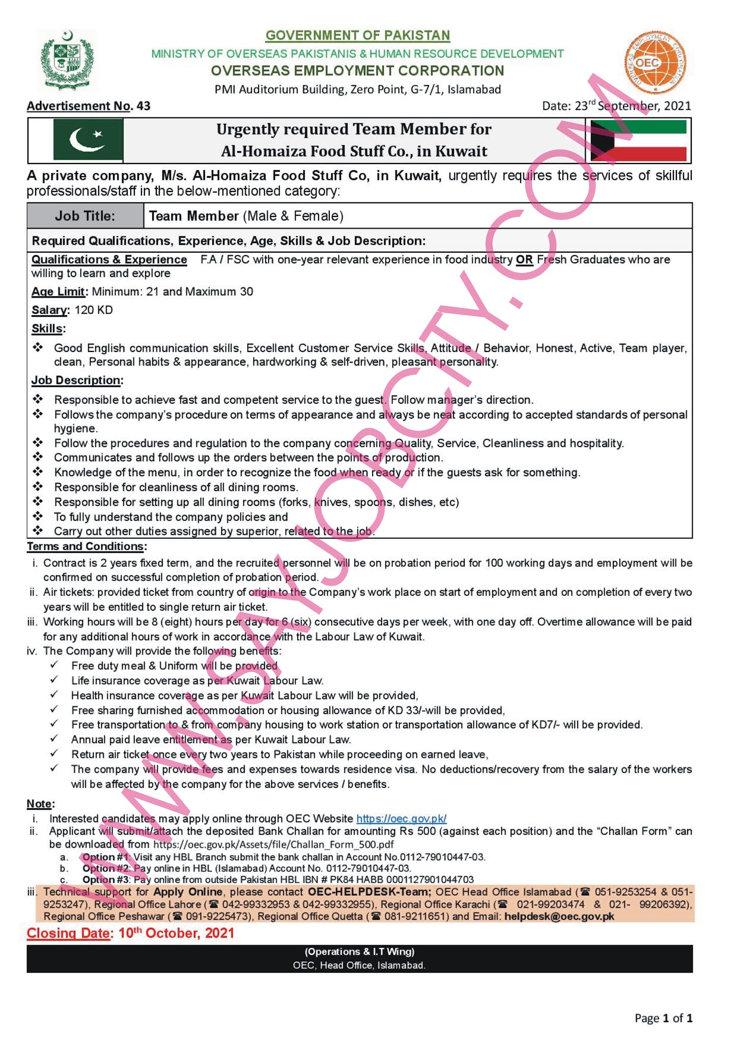 Kuwait Team Member Visa for Pakistani – Job in Kuwait Free Visa – OEC Kuwait Jobs – Overseas Employment Corporation