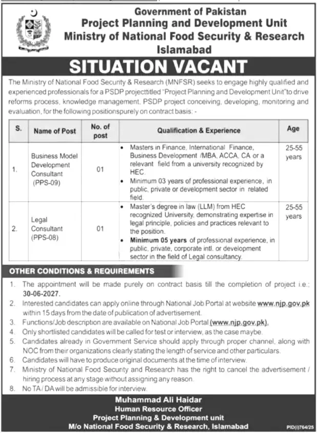 Ministry of National Food Security & Research, MNFS, R, invites applications for vacancies advertised in the daily Jang on July 28, 2025. Vacancies are available for the following positions in Islamabad Pakistan: legal consultant and business model development consultant