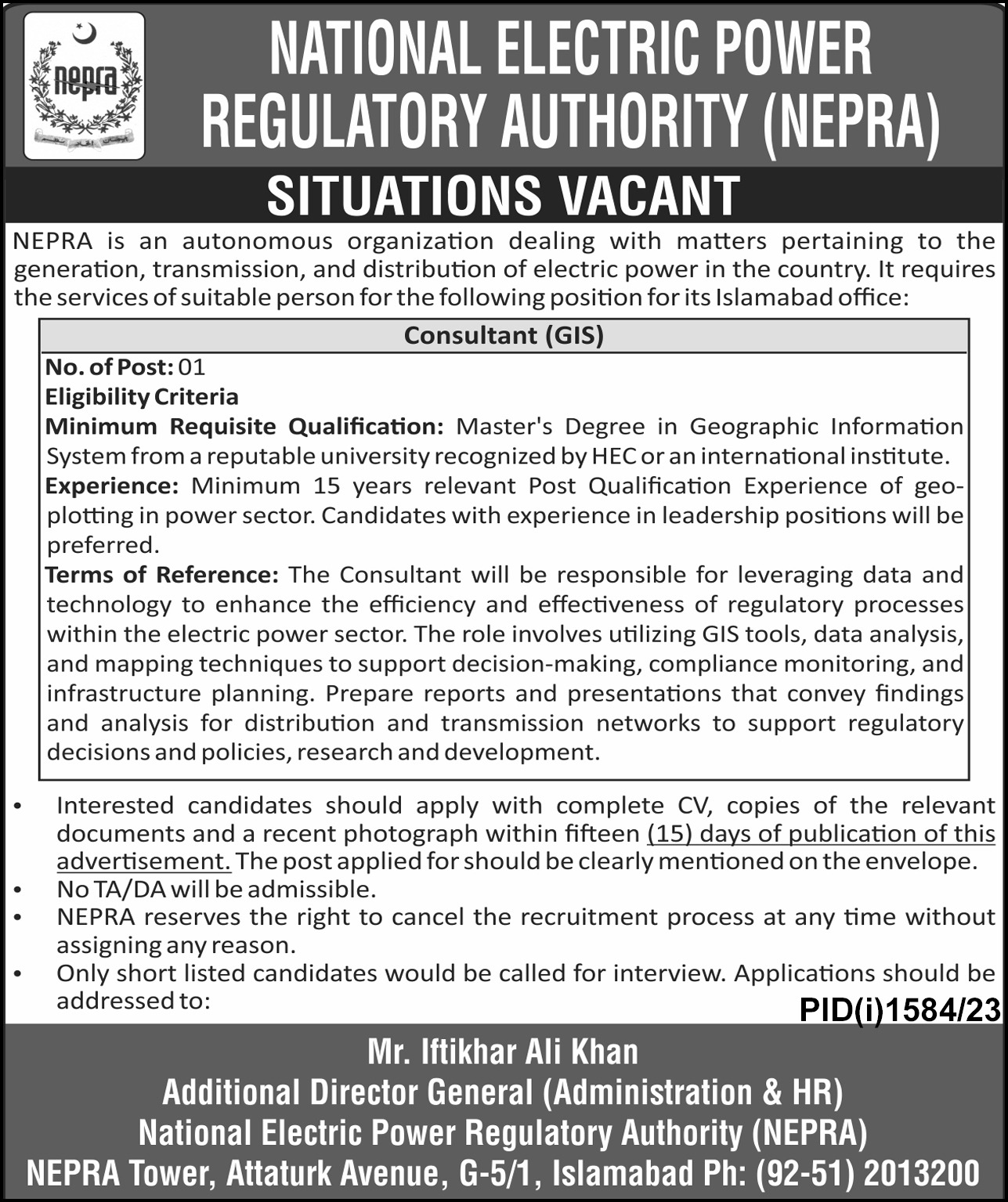 NEPRA Jobs 2023 Islamabad has been announced today for Islamabad etc. Along with representative as according to Nation newspaper. National Electrict Power Regulatry Authority NEPRA Government jobs in Services, Management and others are available in Islamabad Pakistan on Full Time/Permanent foundation. Vacancy Shift is First Shift Day. Qualified candidates with Bachelor and Master Master’s Degree and so on. Education and different fulfilling guidelines & standards for Experienced Non-Manager and others can apply for task.