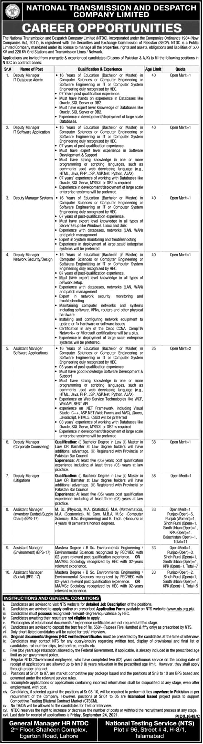 Address: General Manager HR NTDC, 2nd Floor, Shaheen Complex, Egerton Road, Lahore