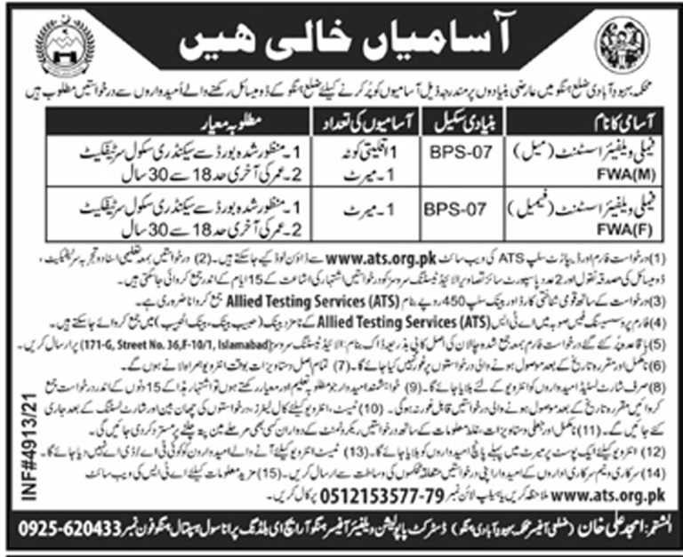 Population Welfare Department Jobs are opening for Family Welfare Assistant (BPS-07) (Male/Female). Applications are invited from male and female applicants having Matriculation to fill these posts. The candidate’s age must be between 18 to 30 years. This employment appointment will be made through the Allied Testing Services ATS.