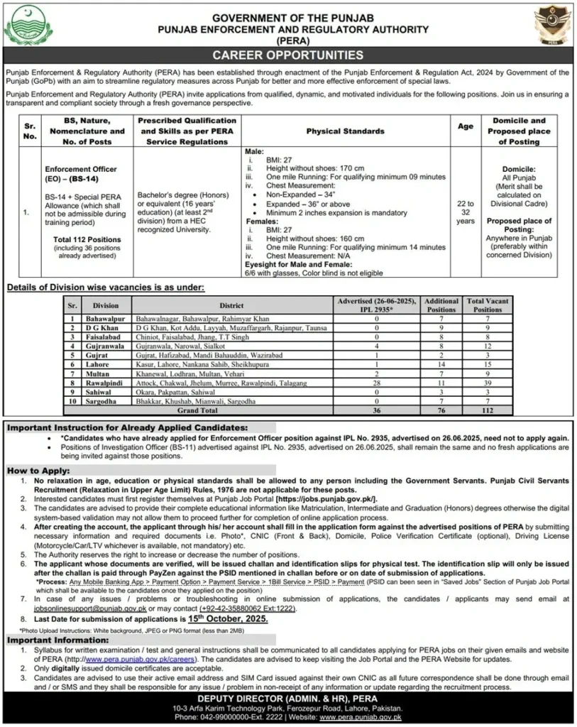 Are you seeking a fulfilling career in the government sector? The Punjab Enforcement and Regulatory Authority (PERA) has announced its latest job openings for 2025, offering excellent opportunities for candidates across Pakistan. These positions are open to both men and women who meet the required eligibility criteria.