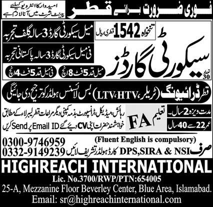 energetic personnel for the posts of Security Guard, LTV Driver, HTV Driver and Trala Driver required for oversea company in Qatar.